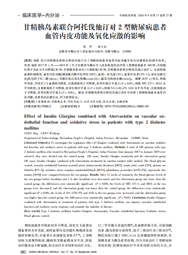 文献题目 :甘精胰岛素联合阿托伐他汀对2型糖尿病患者血管内皮功能及氧化应激的影响