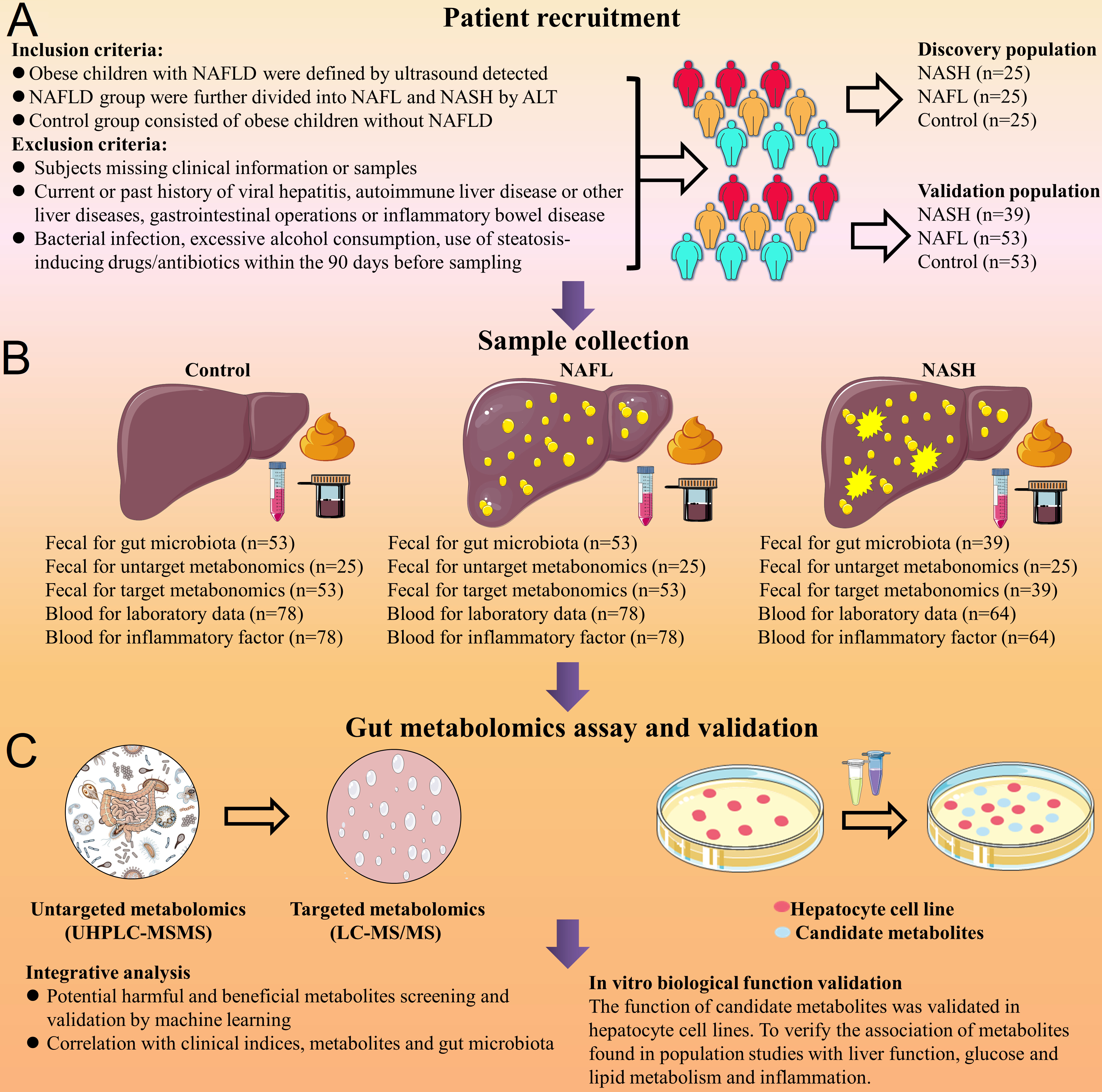 Ñо¿ÈËԱΪÁËÈ«ÃæÁ˽⳦µÀ´úлÎï¶ÔNAFLDµÄÓ°Ïì,ÕÒÀ´ÁËһȺС־ԸÕß,·Ö³É·¢ÏÖ¶ÓÁкÍÑéÖ¤¶ÓÁÐ.·¢ÏÖ¶ÓÁÐÓÐ75¸öº¢×Ó,°üÀ¨25¸ö»¼·Ç¾Æ¾«ÐÔÖ¬·¾¸Î£¨NAFL£©µÄ 25¸ö»¼·Ç¾Æ¾«ÐÔÖ¬·¾ÐÔ¸ÎÑ×£¨NASH£©µÄ,»¹ÓÐ25¸ö·ÊÅÖµ«Ã»¸Î²¡µÄ¶ÔÕÕ×飻ÑéÖ¤¶ÓÁÐÓÐ145¸öº¢×Ó,·Ö×éºÍ·¢ÏÖ¶ÓÁÐÀàËÆ.È»ºóÊÕ¼¯ËûÃǵķà±ãÑù±¾,Óø÷ÖÖÏȽø¼¼Êõ·ÖÎö³¦µÀ´úл×éµÄ±ä»¯.